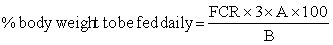The quantity of feed to be given to a pond or cage each day should normally be based on a percentage of the biomass present (total weight of animals). Thus, if a pond contains 10 000 fish weighing 10 g on average and the recommended feeding rate (see later) is stated to be 7% per day, the amount of feed to be given daily is: