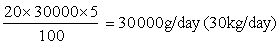 Thus, to continue this example, if the average weight of prawns at the beginning of week 13 (12 weeks after stocking) was 20 g, and the percentage of biomass to be applied was 5%, the daily amount of feed would be: