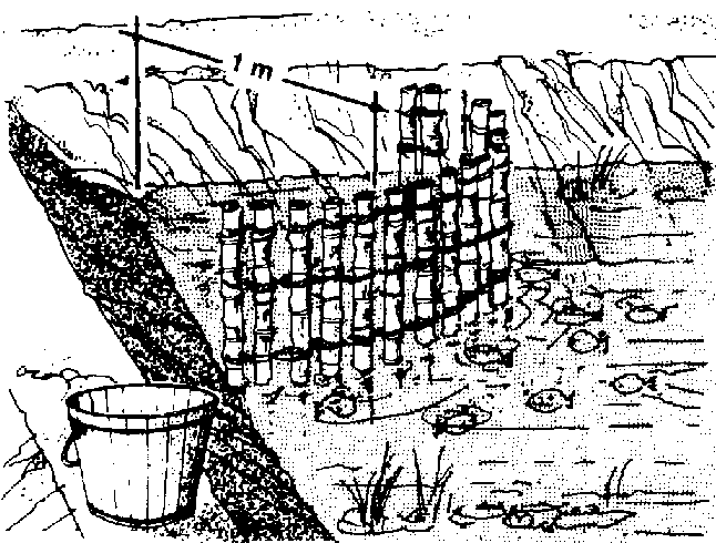 213 In each pond build a crib from bamboo or wood to hold the fertilizer. Build it in one corner in the shallow part of the pond. The drawing below will show you how.