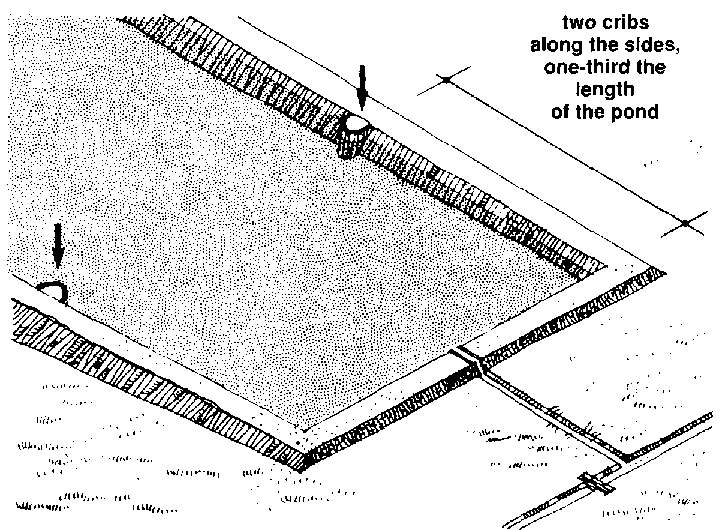 214 If you have a pond that is bigger than 500 square metres you should build two cribs in the pond. The drawings below and on the next page show you where to put them.