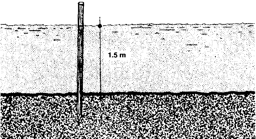 451 Drive four posts into the bottom to form a square of 1.25 by 1.25 metres The top of the posts should reach about 50 centimetres above the water.