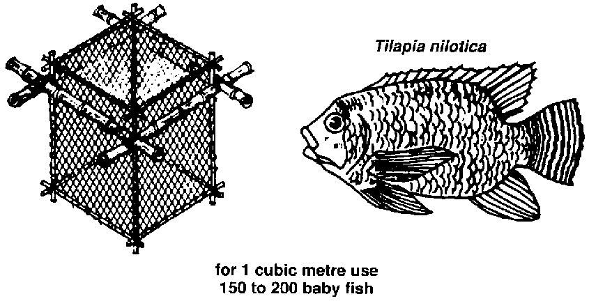 482 If you are raising Tilapia nilotica you will need to put in 150 to 200 baby fish for each cubic metre of cage.