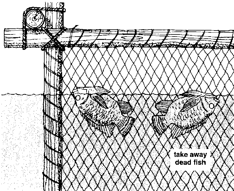 445 You can build a simple cage by driving four or more posts into the bottom under the water and hanging a fish net inside.