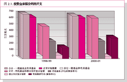 21. 2000-01两年度按资金来源分列的财务帐目所报告的2000-01两年度的开支见表2.1一般基金和有关基金以及信托基金和联合国开发计划署 会计类别项下: