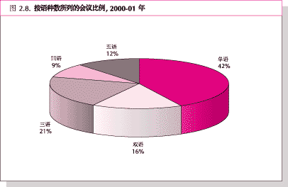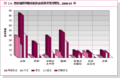 54. 粮农组织会议语言平衡的主要指标是使用5种官方语言会议的比例。使用4种或更多语言的会议有增加的趋势。使用5种语言的会议 从1998-99年度的9%增加到2000-01年度的12%,使用4种语言的会议比例略有增加,使用3种或两种语言的会议比上一个两年度有所下降 (图2.7和2.8)。