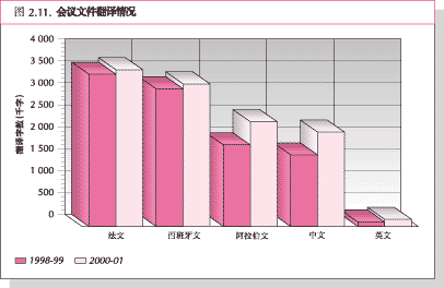 57. 在正式会议文件方面,2000-01年度粮农组织各种资料中每种语言的翻译字数都有 增加,总数达到2390万字,比1998-99年度的1860万字增加了28%。中文、阿拉伯文、西班牙文和法文分别增加71、48、15和11个百分点 (见图2.11)。