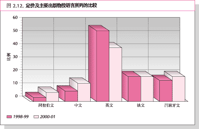 60. 在本两年度内,粮农组织阿拉伯文、 中文和西班牙文出版物增加幅度很大(见图2.12)。1998-99年度,所有期刊出版物和主要文件的54%使用英文,而在2000-01年度减 少到41%。法文出版物的比例稳定在19%,西班牙文出版物从16%增加到19%,阿拉伯文出版物从3%增加到7%,中文出版题目从8%增加到14%, 这主要是和中国农科院一贯的合作安排结果,也是在2001年中期为此安排的特别预算的结果。