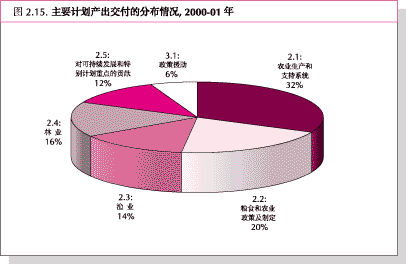 81. 主要计划2.1:农业生产和支持系统的产出交付量最大-占总数的32%,见图2.15。它占方法和准则的49%,协 调和信息交流的39%和培训的37%。主要计划2.2:粮食和农业政策及发展占所有产出量的20%,其次是主要计划2.4: 林业占16%、2.3:渔业占14%和2.5:对可持续发展和特别计划重点的贡献占12%。而主要计划3.1:政策援助 只占总产出的6%,占对成员国的直接咨询和实地计划支持方面产出的16%。