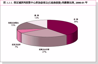 452. 2000-01两年度外部供资的区域分布与1998-99两年度相比(表 3.2.4), 非洲是大幅增加(9.72亿美元,从5.59亿美元)还有欧洲(从2.44亿美元到3.11亿美元)。外部供资减少的为近东和北非从5.68亿美元到1.86亿 美元,亚太地区从9.41亿美元到6.71亿美元,以及拉丁美洲和加勒比从8.99亿美元减少到3.85亿美元,反映在所批准的项目减少。各区域投资 额比例见图3.2-3。