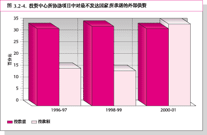 453. 对最不发达国家的外部资金承诺额从1998-99年的15%大幅增至2000-01 年的35%。此增长 部分是由于纳入上一个两年度未计算在内的粮食安全特别计划和技术合作项目所致 。此外, 其它国家的官方发展援助比最不发达国家下 降得更多。资助最不发达国家项目的数量从26个增至30个,但仍为总量的大约三分之一(图3.2-4)。