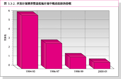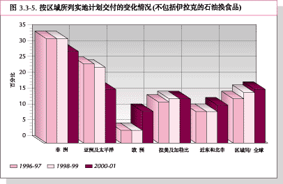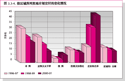 457. 1996-97年以来,实地计划交付额逐步增长, 2001-02两年度达到6.872亿美元,比1998-99年增24%(表3.3-1)。然而,这主要是因为紧急援助量增加,伊拉克石油换食品计划增加约70%,2000-01年达到2.49亿美元。其它特别救济活动增加将近3倍从1998-99两年度的2720万美元至7630万美元。其它一些领域的交付也有增长,特别是单边信托基金增长22%至4810万美元。从总体看,实地计划的非紧急部分2000-01年下降约5%,比起1998-99年14%的下降有了极大的改进。
