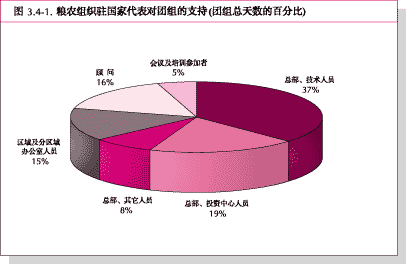 471. 粮农办事处为所在国家代表团提供后勤服务的分配情况见图表3.4-1。总部技术官员占代表团天数的37%,投资中心职 员占19%,外聘顾问占16%,区域和分区域官员占15%。全年度而言,粮农办事处大约每7天平均接待35个代表团。