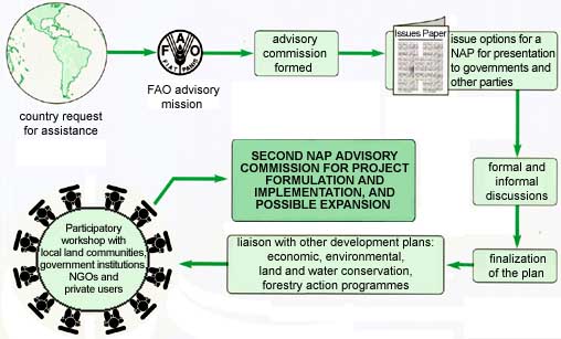 The first step is for a country's government to request representatives of FAO and other international agencies to participate in a multidisciplinary NAP advisory mission. The task of the advisory mission is to identify the need for a NAP, its nature and approximate magnitude, and the approximate location where priority activities are to be implemented.