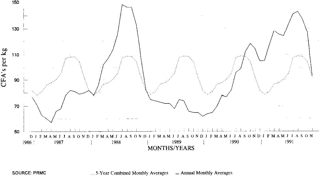 Another reason for not storing is the unpredictability of future prices, which often makes storage a risky business. This is particularly the case in countries such as Mali where prices vary widely from year to year, and do not follow a steady monthly trend. From Figure 1.1 (see Figure 1.1. Retail Prices of Millet in Mali, 1986 - 1991 Annual Monthly Averages compared with Monthly Averages combined over 5 years), it can be seen that Malian prices normally rise between harvest time and the lean season, but farmers who engaged in speculative storage in 1989 suffered significant losses. Storage was particularly risky as Mali was passing from a period of scarcity, when prices levels were related to the cost of imports, to a period of surplus, when they were related to the price at which Mali could export. Movement between surplus and deficit in the Sahelian countries probably explains the wide variation in Mali's prices from year to year.