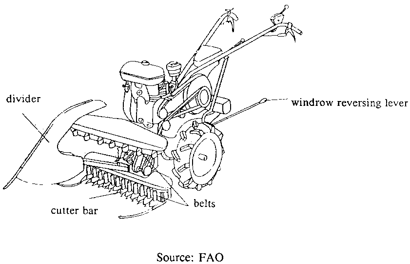 Combine-harvesters, as the name implies, combine the actions of reaping and threshing. Either the 'through-flow' or the 'hold-on' principle of threshing may be employed, but the reaping action is basically the same. The main difference is that combine-harvesters of the Western ('through-flow') type are equipped with a wide cutting bar (4-5m) while the working width of the Japanese ('hold-on') units is small (1m). According to the type of machine used, and specially to their working width, capacities range from 2 to 15 hours per hectare.