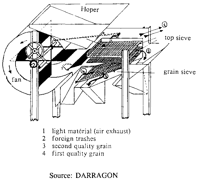 In developing countries, mechanizing the cleaning operation at village level has seldom been felt as a necessity, because of the lack of quality standards in grain trading. However, because of the current trend towards privatization of marketing networks, the demand for cleaning machines will probably increase. The local manufacture and popularization of simple and easily portable equipment, such as winnowers or screen graders suited to cereal crops, need to be encouraged. CIRAD/SAR has recently developed cleaning machines of the rotary type with outputs of a few hundred kilogrammes per hour.