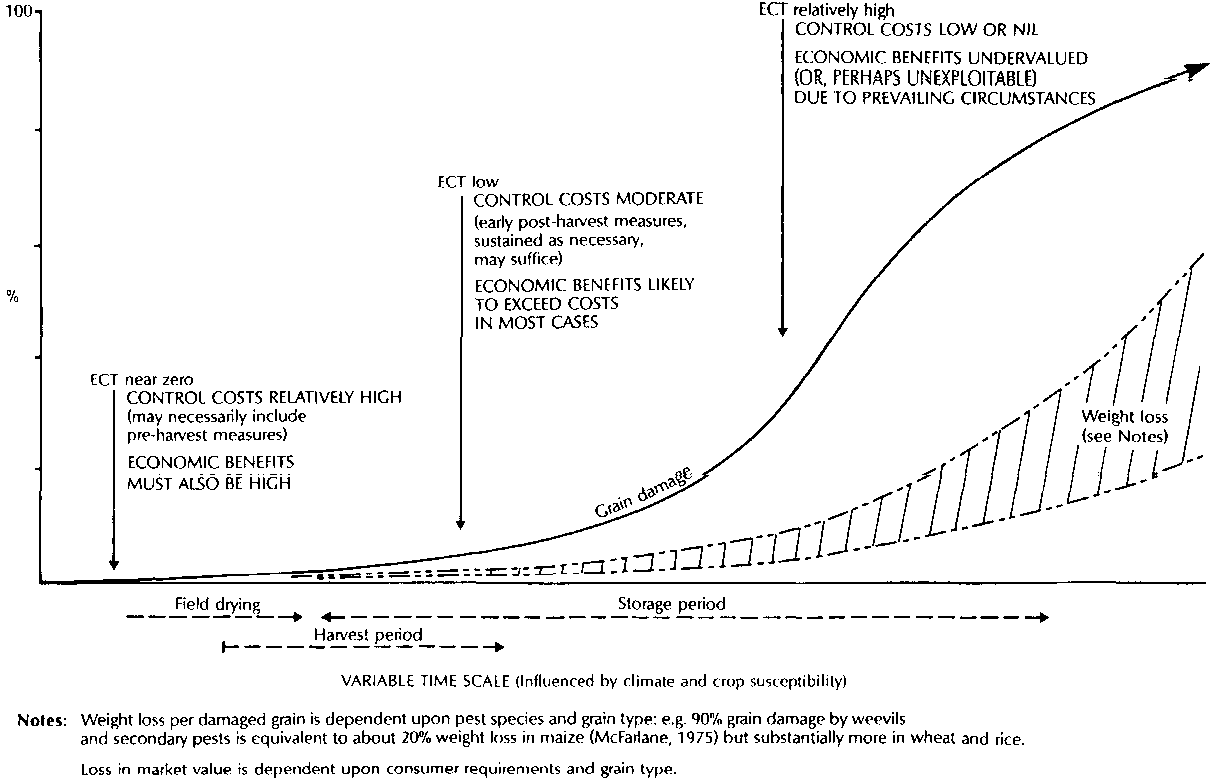 The economic justification of control measures, including where necessary the use of chemical pesticides, should take account of all costs and benefits. Many of these may be assessable only in subjective terms that are greatly dependent upon local attitudes and sensibilities. However, measurable losses of quantity and certain quality parameters can be objectively determined. A manual of methods for the evaluation of postharvest losses (Harris and Lindblad, 1978) is available and provides useful information, subject to a need for modification of some methods in particular circumstances. A critical review of the methodology (Boxall, 1986) gives further guidance based upon experience gained, since 1978, from field work in many developing countries. Choices among methods, several of which have become subjects of considerable controversy, should always be made with due regard to the actual circumstances and the prevailing objective. There is no single 'best method' for all circumstances and, for practical purposes, operational facility and repeatability are generally more important that fine precision. From the storekeeper's viewpoint a demonstrable loss reduction from, say, 5% to 4%, however statistically significant, may be of little or no practical importance; whereas a reduction from 10% to 5% (or from 2% to 1% in a sophisticated storage system) may be of considerable interest: provided, always, that the demonstrated reduction can be achieved in routine practice.