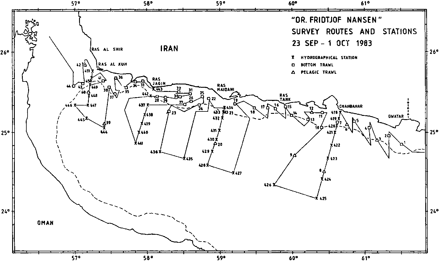 The vessel sailed from karachi, Pakistan in the evening of 21 September 1983, and the survey started at the Pakistan border at 0100 hours on 23 September. A zig-zag survey track was laid over the coastal banks between the 10-20 m and 500 m isobaths. Five course tracks were sailed to the median line of the Gulf of Oman. The area was investigated up to Ras al Shir, and the cruise was concluded at 0200 hours on 1 October 1983. The vessel berthed at Dubai on 1 October at 16 hours.
