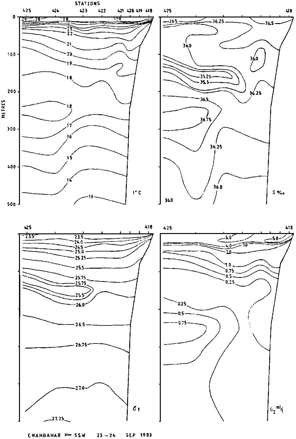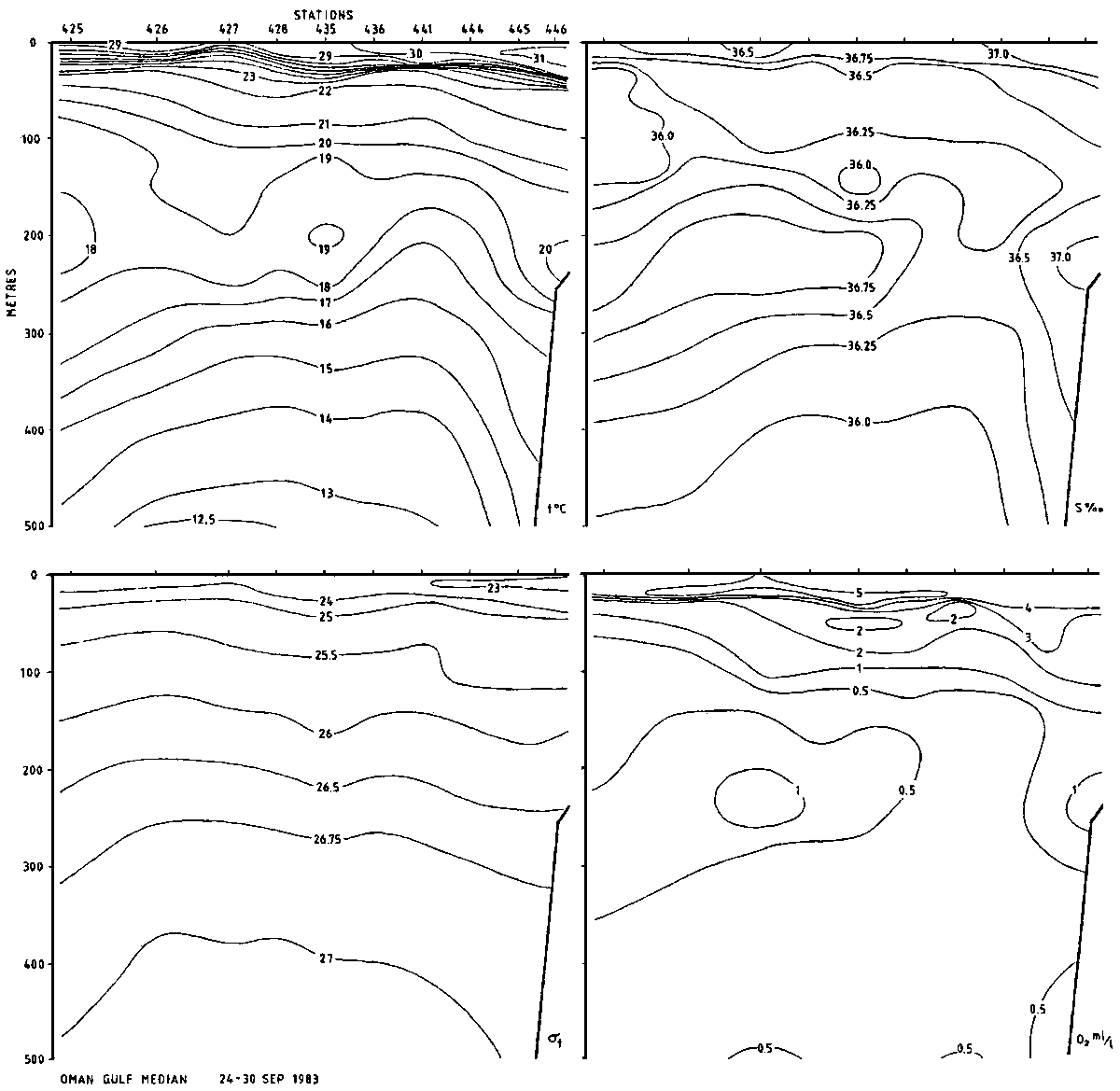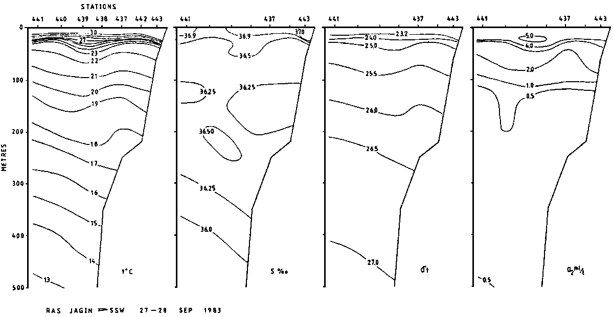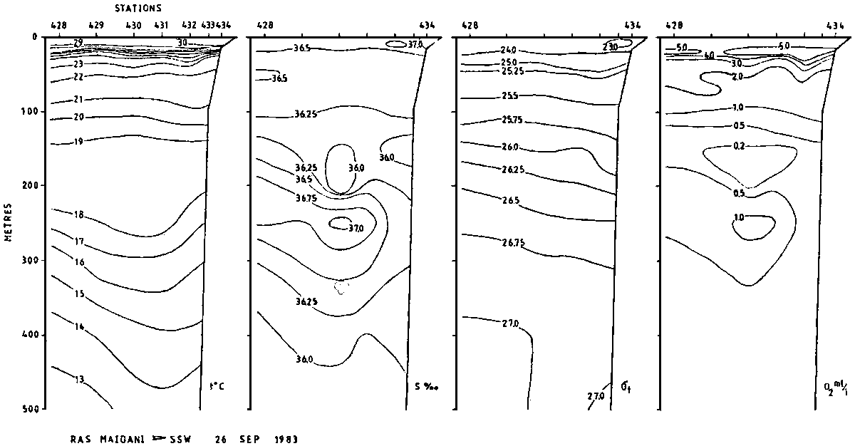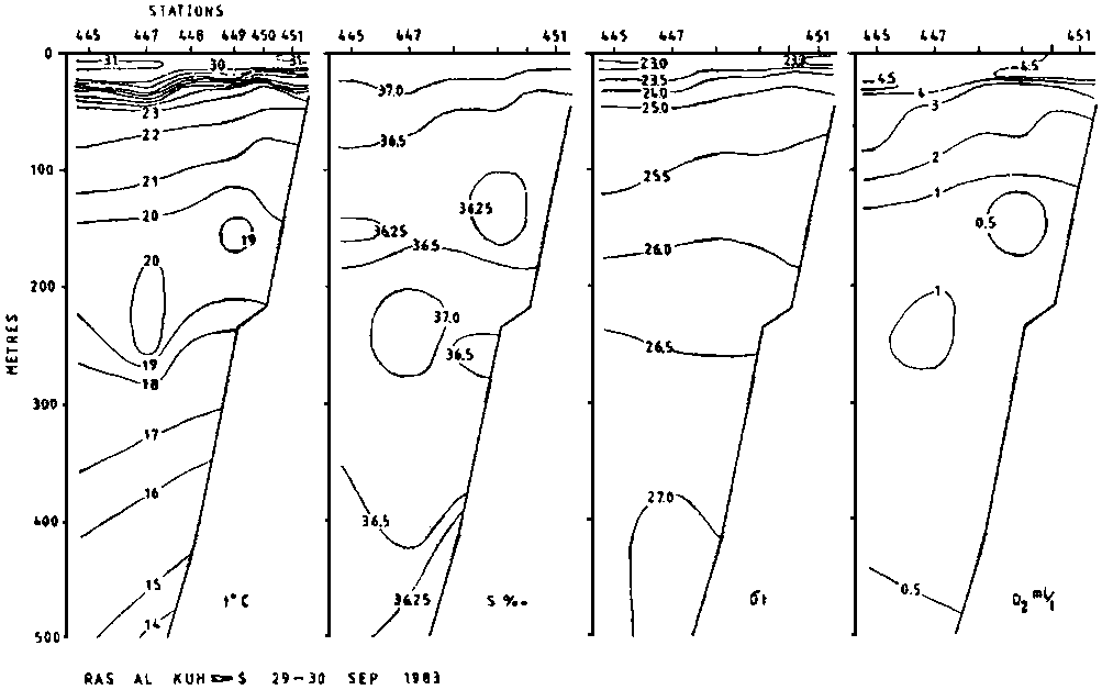 The temperature in the surface layer was measured to 30-31°C at the head of the Gulf, decreasing eastwards to 28-29°C. Likewise, the salinity was above 37 permille at the Ras al Kuh transect, decreasing to 36.5 off Chahbahar. A sharp thermocline was found at 20-40 m depth, from 29-30°C to 22-23°C. Between 100 and 200 m a minimum of temperature and salinity was recorded, and an intermediate maximum was observed between 200 and 300 m. In the deeper layers temperature decreased to 14°C at the head of the Gulf and 12.5 further east (500 in depth). The salinity was below 36 permille in the deeper layer, a little above at the head of the Gulf.