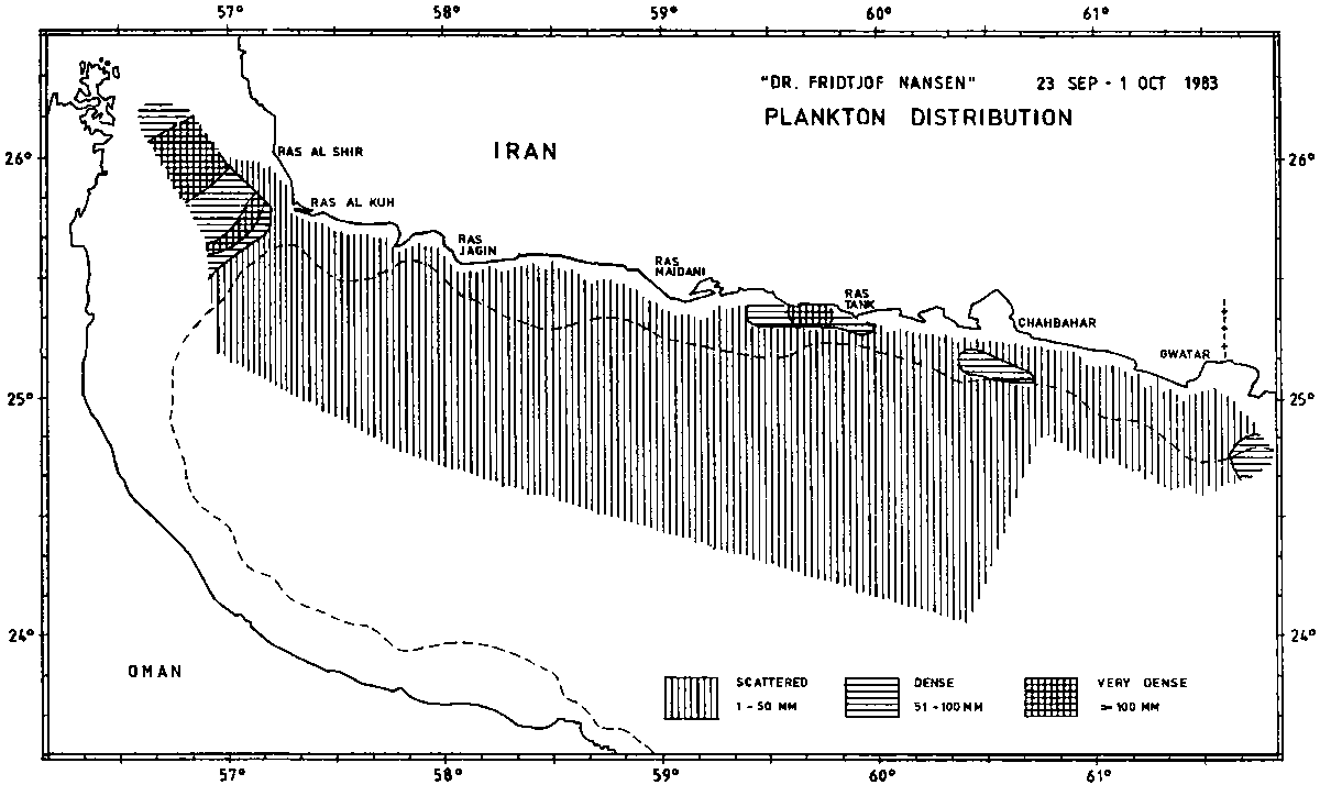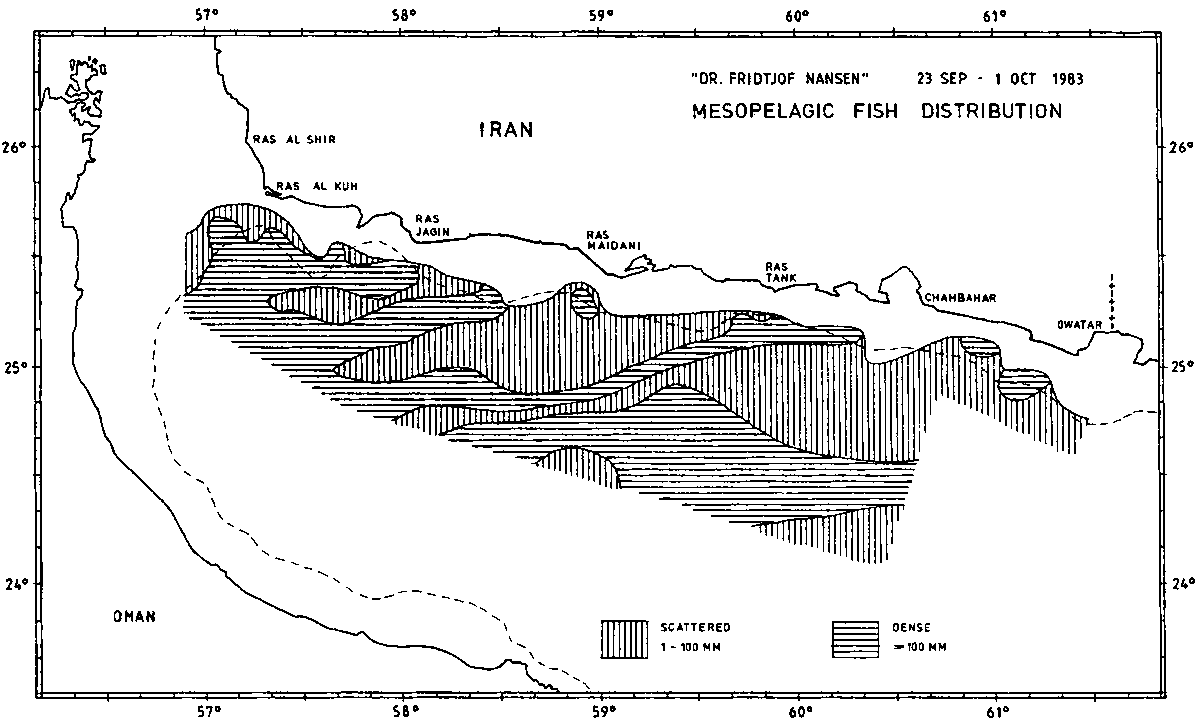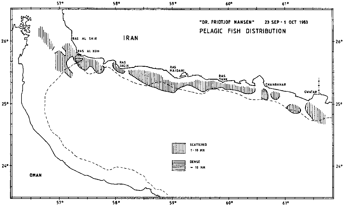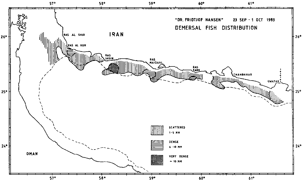 Demersal fish distribution is presented in Figure 8. Some denser concentrations were recorded off Gwatar, Ras Tank, Ras Maidani, Ras Jagin and Ras al Kuh, but generally the registrations were poor.