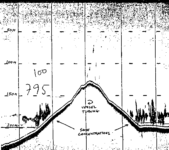 Mesopelagic fish distribution is given in Figure 9. The expected diurnal migration pattern was observed: in daylight schools and scattering layers at 150 m and deeper, ascending at nightfall to the upper 50 m and again descending at daybreak. The densest concentrations were found between 150 and 200 m near the slope in daytime. An echogramme of such recordings is given in Figure 11.