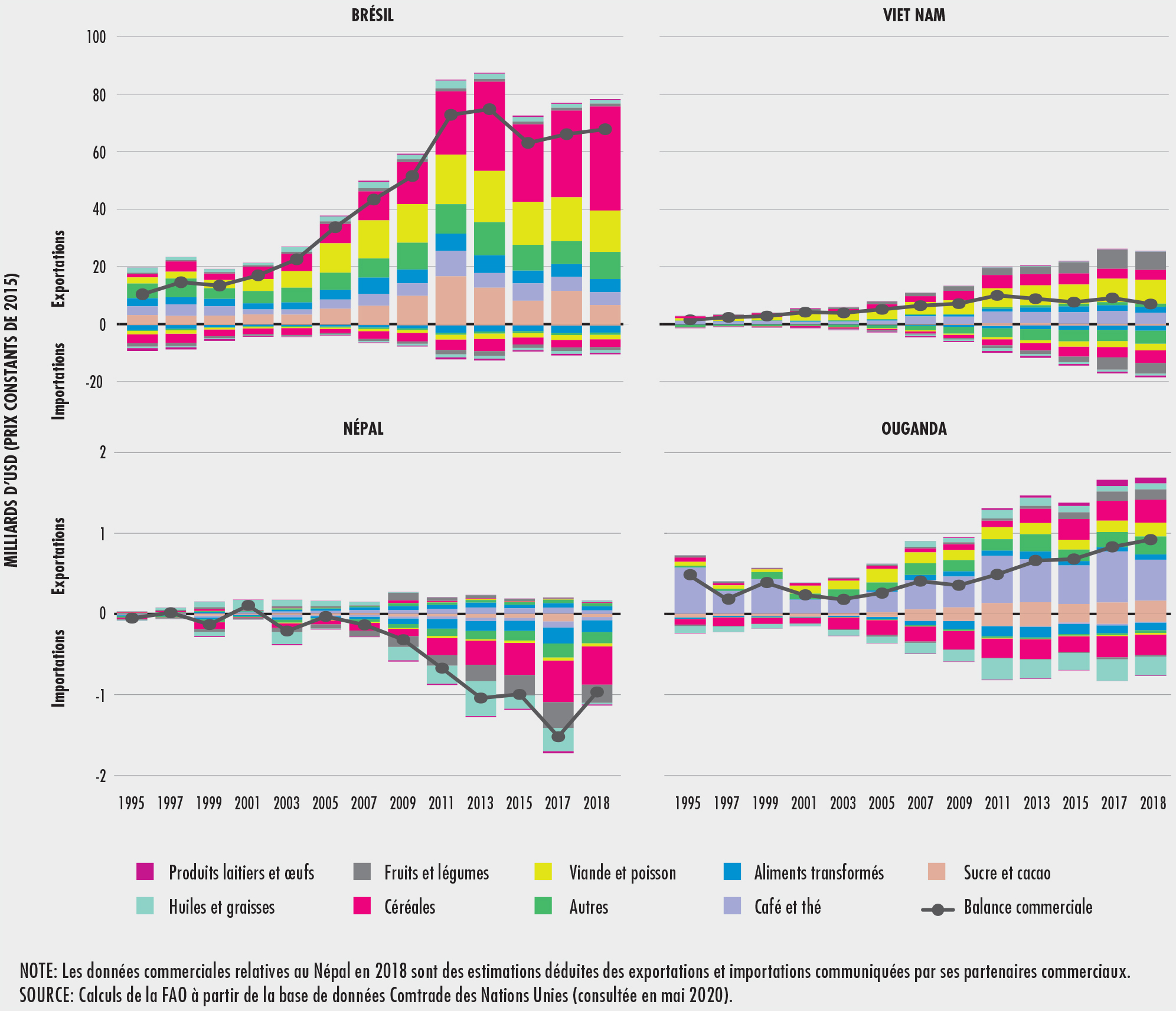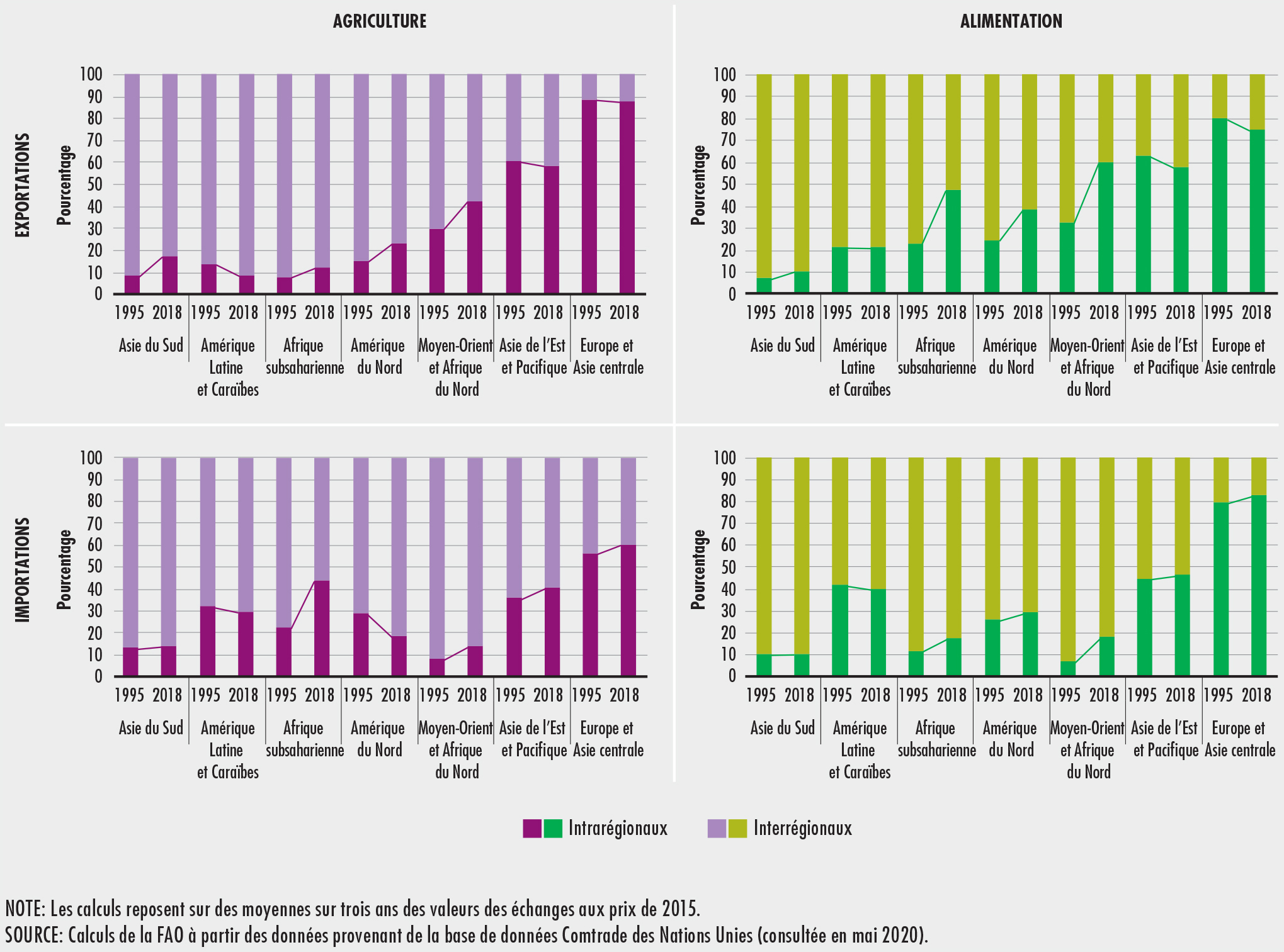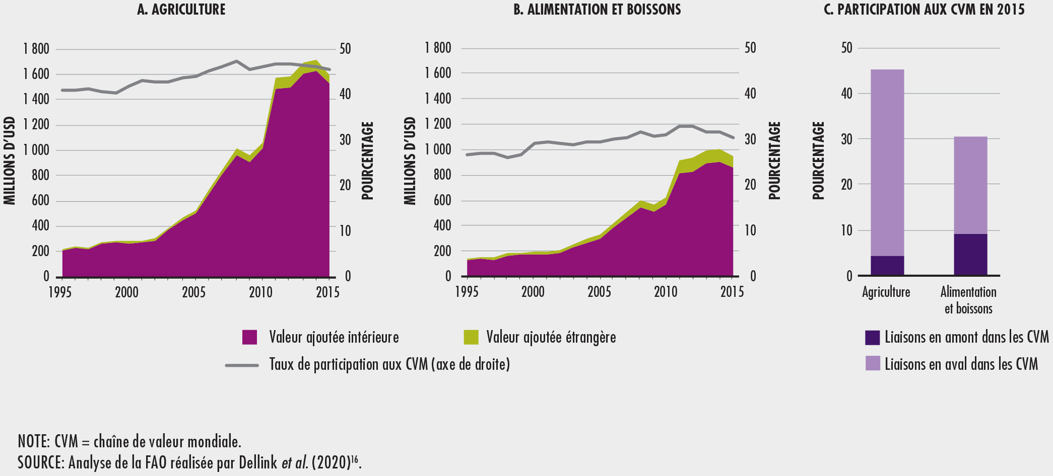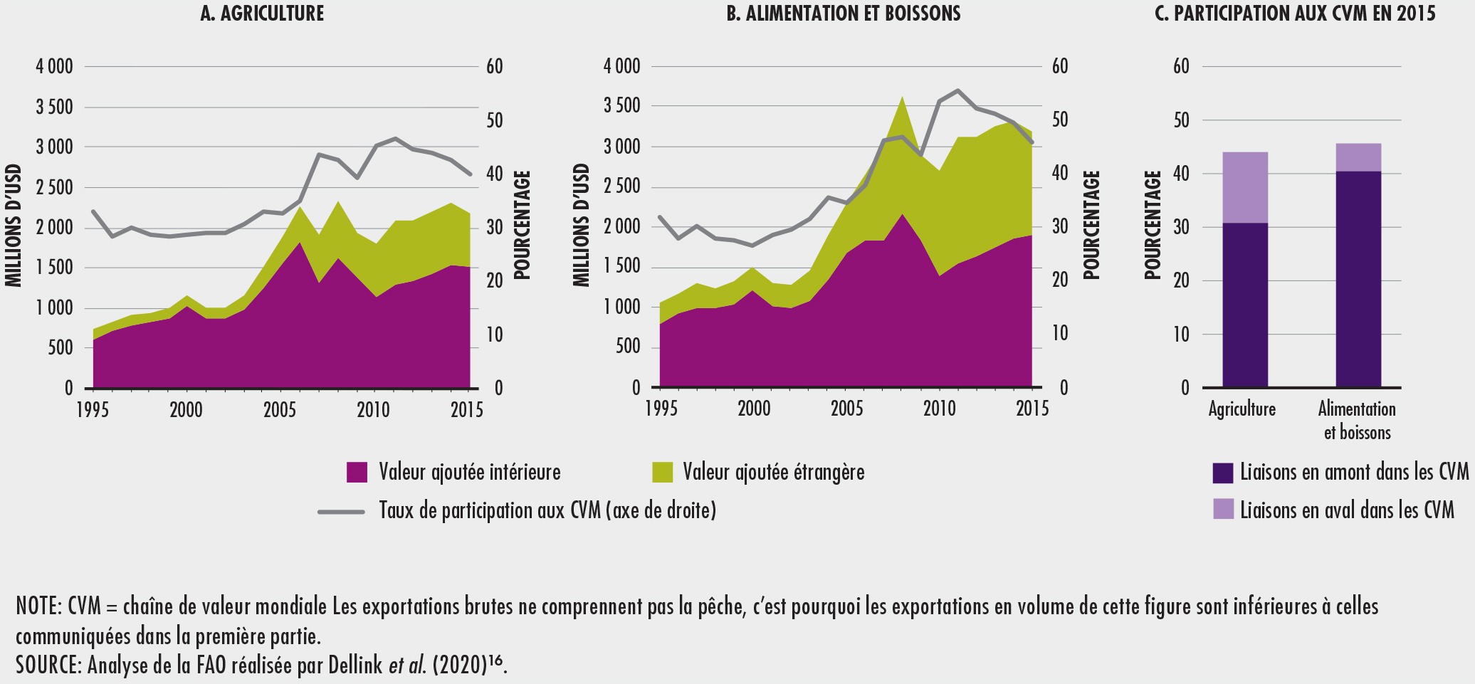 Les échanges de produits alimentaires et agricoles ont plus que doublé en termes réels depuis 1995. Les pays émergents et en développement sont devenus des acteurs sur les marchés internationaux, et ils contribuent désormais pour un tiers environ au commerce mondial. Les progrès technologiques ont transformé les procédés productifs et commerciaux, ce qui a permis l’émergence de chaînes de valeur mondiales de l’alimentation et de l’agriculture. On estime que plus d’un tiers des exportations alimentaires et agricoles a lieu à l’intérieur de chaînes de valeur mondiales.