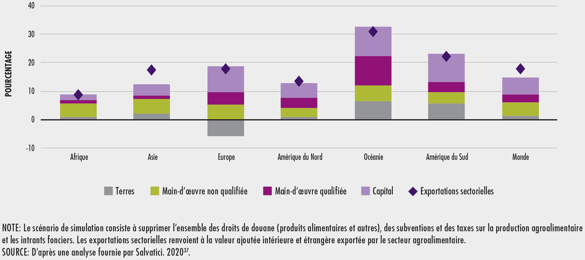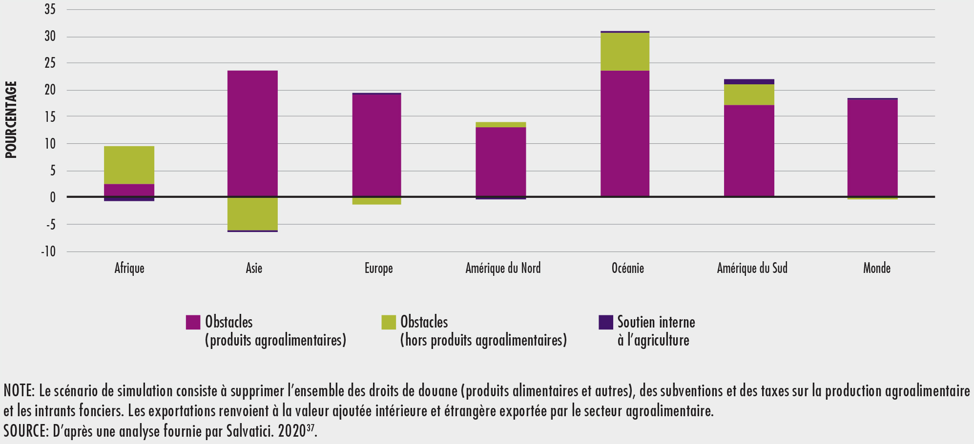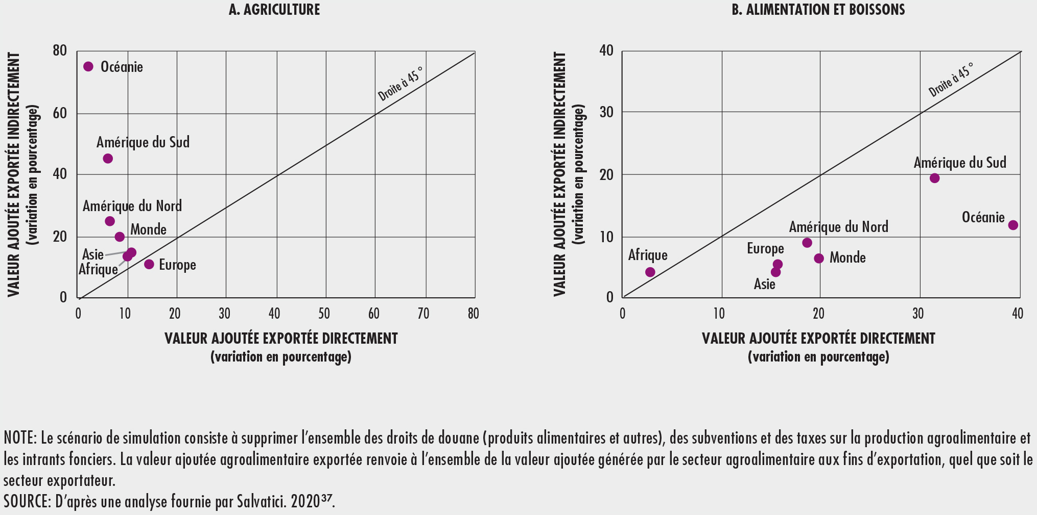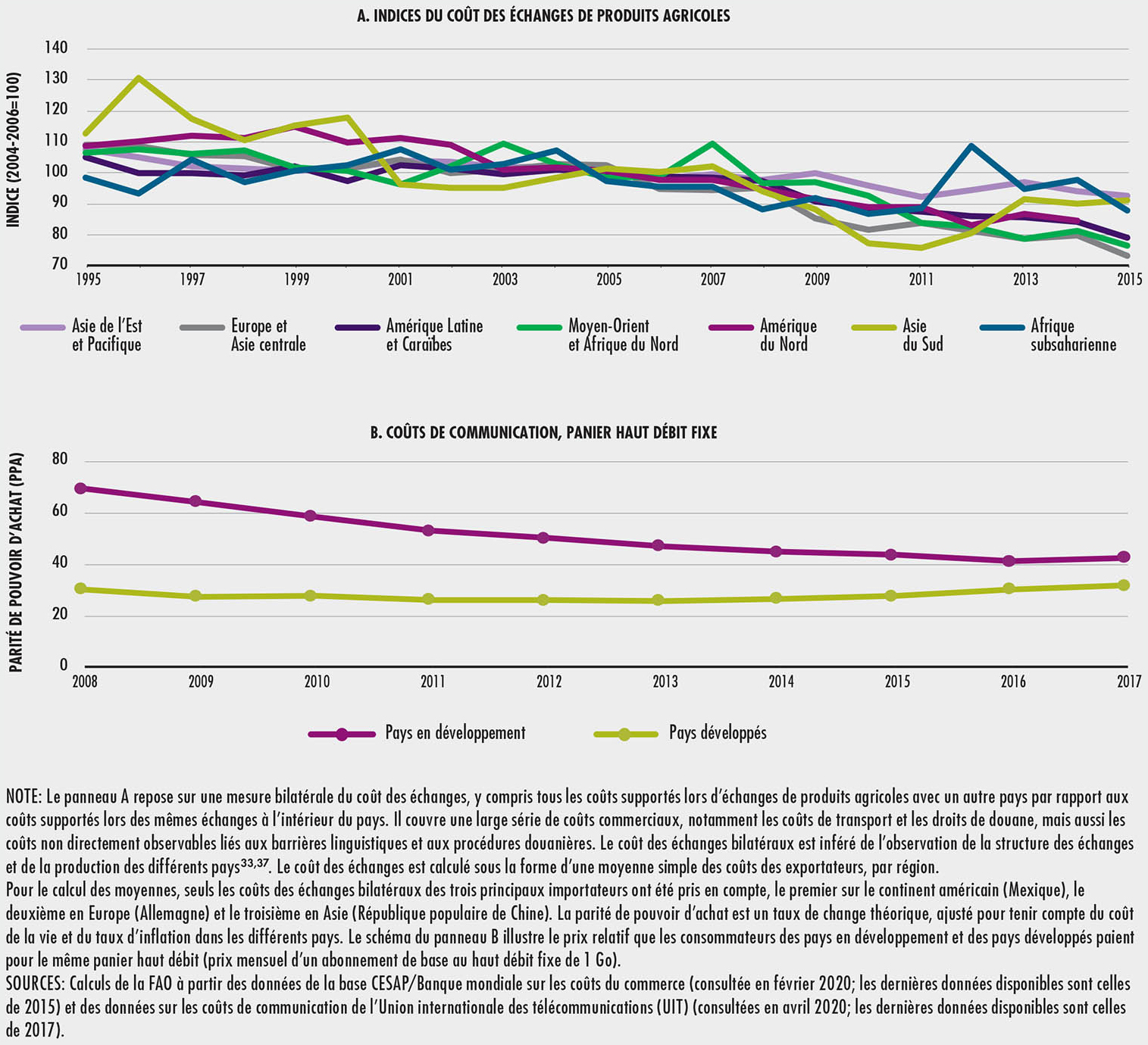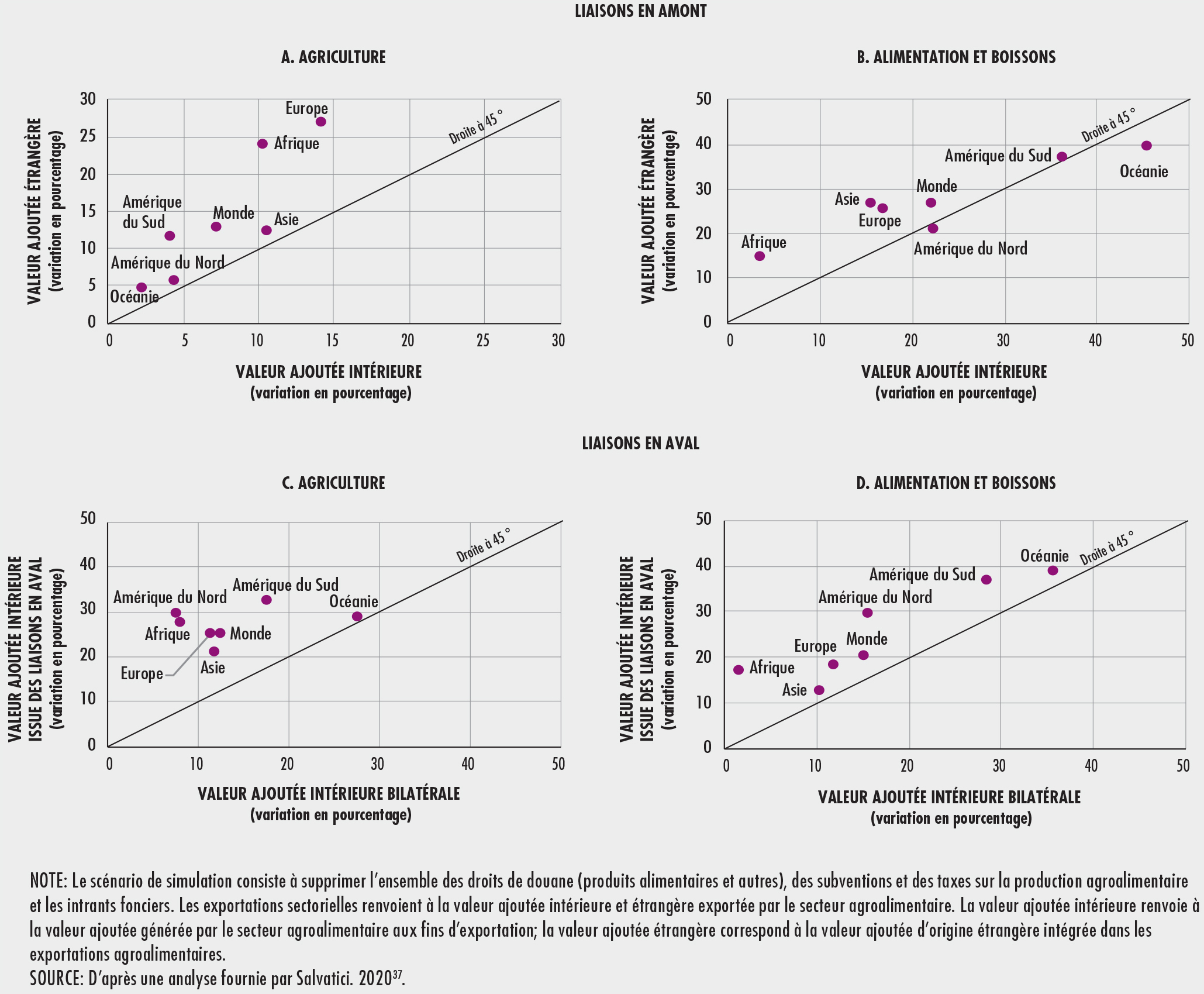 Les échanges de produits alimentaires et agricoles ont plus que doublé en termes réels depuis 1995. Les pays émergents et en développement sont devenus des acteurs sur les marchés internationaux, et ils contribuent désormais pour un tiers environ au commerce mondial. Les progrès technologiques ont transformé les procédés productifs et commerciaux, ce qui a permis l’émergence de chaînes de valeur mondiales de l’alimentation et de l’agriculture. On estime que plus d’un tiers des exportations alimentaires et agricoles a lieu à l’intérieur de chaînes de valeur mondiales.