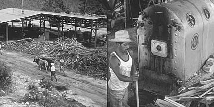 In developing countries wood-based fuel remains a dominant source of energy; piles of wood scraps fuel this boiler for electricity production, Honduras |