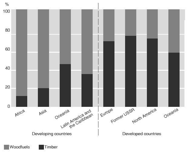Approximately 60 percent of the world’s total wood removals from forests and trees outside forests are used for energy purposes. In other words, woodfuel is one of the main products of forests and trees. While only 30 percent of the wood produced in developed countries is used for energy (33 percent in Europe and 29 percent in North America), in developing countries that amount reaches 80 percent. In Africa, Asia and Latin America woodfuels account for 89, 81 and 66 percent, respectively, of total wood consumption (Figure 3).
