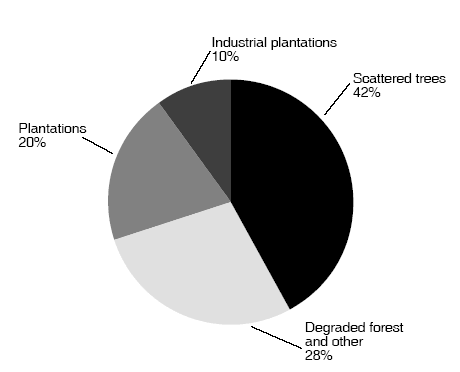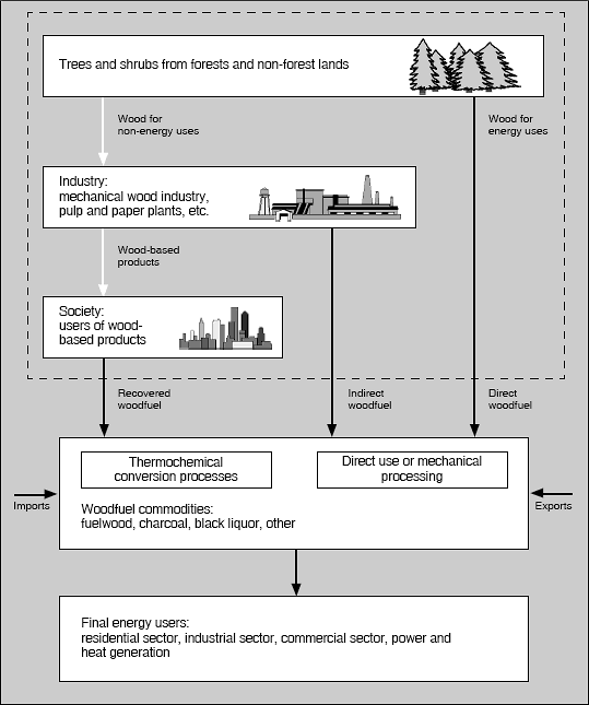 Figure 4 shows a typical area-based wood flow for energy and non-energy uses, with woodfuel types derived from different forest and non-forest supply sources (including trees outside forests, such as those planted under agroforestry and community tree-planting schemes). As shown, by products of forest industries (sawmills, particle board plants, etc.) often constitute an important source of woodfuel, particularly in developed countries.