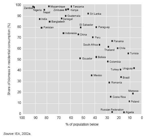 A large and significant group of users remains outside, or at best only on the periphery of, the money economy. Some 2.8 billion people, for example, earn less than US$2 per day, and low daily income is strongly correlated with use of biomass for energy (see Figure). Most users of this type live in developing countries, where woodfuels are a vital component of the primary energy supply (IEA, 2002a). A large part of these users have relatively limited access to alternative fuels for cooking or home heating. For many of them, fuel options are currently confined to locally available energy that can be gathered for the cost of the time and physical exertion (“sweat equity”) involved in its collection.