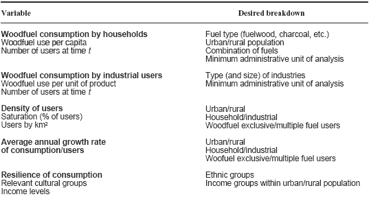 The demand module portrays the spatial distribution of woodfuel consumption, disaggregated, if possible, by fuel type (fuelwood, charcoal, others), by sector of users (households, industrial, others) and by area (rural, urban). It is also used to identify those areas showing distinctive consumption dynamics (e.g. increasing woodfuel needs). The main sources of information in developing this module are statistics on demography and other socio-economic parameters collected and maintained by national statistical services, and studies and surveys that contain information on unit consumption by type of user, for example.