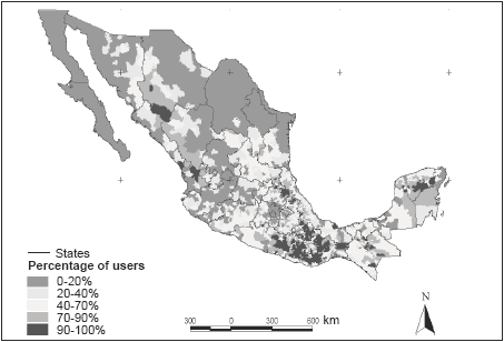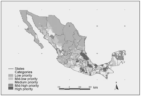 (O.R. Masera, R. Drigo and M.A. Trossero, in preparation). Spatial information from detailed local surveys on fuelwood consumption (Figure 2) was integrated with sociodemographic historical series and land use/land cover statistics (Figure 3). The analysis helped to identify 273 counties where action to ensure the sustainability of fuelwood use is urgently needed (Figure 4).