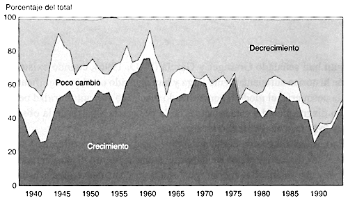 A pesar de las oscilaciones que se observan en el gráfico, la proporción de recursos que crecen aumenta aproximadamente, desde un 35 por ciento a comienzos de la serie, sobrepasan el 70 por ciento a finales de la década de los cincuenta y principios de los sesenta y se mantienen alrededor del 60 por ciento hasta mediados de los ochenta. A finales de la serie, estos recursos están casi al mismo nivel que al comienzo de la serie. Por otro lado, la proporción de recursos que se mantienen con poco cambio disminuyen considerablemente durante el período (de aproximadamente un 30 por ciento a sólo un 2-3 por ciento). Esta categoría de capturas estables con pocos cambios corresponde a una fase sin desarrollo (fase I) en estado latente, a una estabilización de las capturas una vez que se ha alcanzado la fase de madurez (fase III) o incluso a recursos que han sufrido colapsos (fase IV). De todas formas, el decrecimiento en el tiempo de la proporción de recursos con pocos cambios indica claramente que se ha producido una reducción de las pesquerías en la fase sin desarrollo o en la fase de madurez, e ilustra la tendencia de las pesquerías cubanas (similar a la de las pesquerías mundiales según Grainger y García [FAO, 1996]) a agruparse en dos categorías básicas: en expansión o en decadencia.