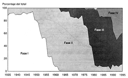 A las capturas estandarizadas de cada una de las series históricas se ajustó una función de polinomios de tercer grado; se calculó la pendiente de la línea ajustada para cada par de años sucesivos, y cada curva se dividió en segmentos correspondientes a las fases en que las capturas «crecen», manifiestan «pocos cambios» o «decrecen». Se asumió que las fases de crecimiento o de contracción corresponden a la fase de desarrollo (fase II) o a la fase de decadencia (fase IV) respectivamente. La fase de poco cambio se clasificó posteriormente como intensamente explotada (fase III, de madurez) o sin desarrollo (fase I) dependiendo de si el período de poco cambio era seguido o no por un período de crecimiento. El patrón general combinado para todas las especies se muestra en la Figura 4.