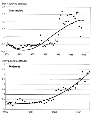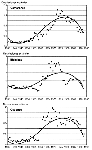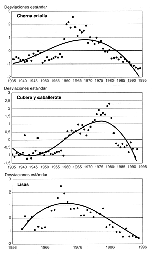 Para poder hacer una comparación de cada una de las diferentes series históricas, todos los datos de capturas anuales fueron estandarizados de manera que sus medias fueran iguales a cero y sus desviaciones estándar iguales a 1. Este procedimiento estadístico hace comparables todas las series pues en cada caso y en cada año lo que se mide es la magnitud de las desviaciones, positivas y negativas, con respecto a la media de toda la serie. Después, mediante la comparación de los datos disponibles cada dos años consecutivos, cada elemento de la serie y cada recurso se colocaron en una de las siguientes tres categorías: de crecimiento, de poco cambio y de decrecimiento, dependiendo de si la pendiente de la serie, entre los dos años considerados, era superior a 0,05, entre +0,05 y -0,05, o inferior a 0,05 respectivamente.