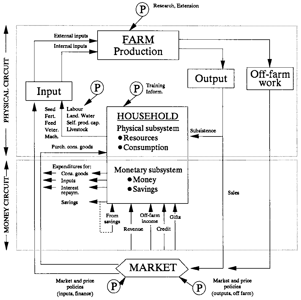 Figure 3.1 depicts the main economic relationships governing activities in mixed smallholder farming systems. Two major circuits can be identified: the physical circuit, with flows of factor services and products and the cash flow or monetary circuit. Each will play a different role in determining a household's response to policy measures, depending on the point the household occupies in the continuum between subsistence and commercial farming.