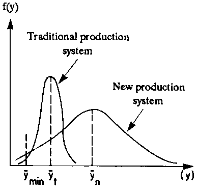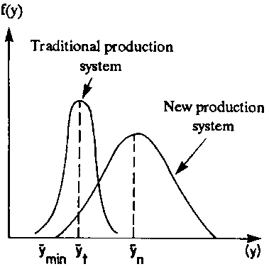 Box 3.1: Subsistence, risk and innovation. Figure 3.2a depicts a case where a new technology is associated with both higher potential production and higher risk of failure. The new technology in Figure 3.2b, on the other hand, both reduces the risk of failure and raises mean production above the level of the traditional technology. To mainly subsistence-oriented farmers, this technology will be preferable, although its potential is not as high as the new technology in Figure 3.2a. Figure 3.2. Income and risk of innovation. a. Innovation with higher mean production. but higher probability of failure below minimum consumption.