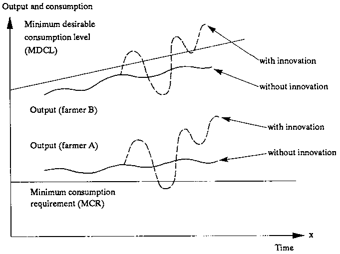 Attitudes towards risky innovations will depend on how close to bare survival current production lies. This is illustrated in Figure 3.3. Farm A, due to its limited production potential, has always produced close to its minimum consumption requirement (MCR). Farm B. on the other hand, has operated closer to (though always below) its minimum desired consumption level (MDCL). Farm A will have more incentive to minimise risk than farm B. which is more likely to innovate because the chances of falling below its MCR are relatively low. Despite its higher yield variability, the new technology will be attractive to farm B provided adoption increases output above MDCL. Whether or not it adopts new technology, farm A is unlikely to produce a surplus for sale. Farm B. on the other hand, is much more likely to do so, and may eventually move out of the mainly subsistence-oriented group of producers to become a semi-subsistence farm. Figure 3.3. Risk of innovation close to (A) and well above (B) minimum consumption requirements. Source: Adapted from Miracle (1986). |
