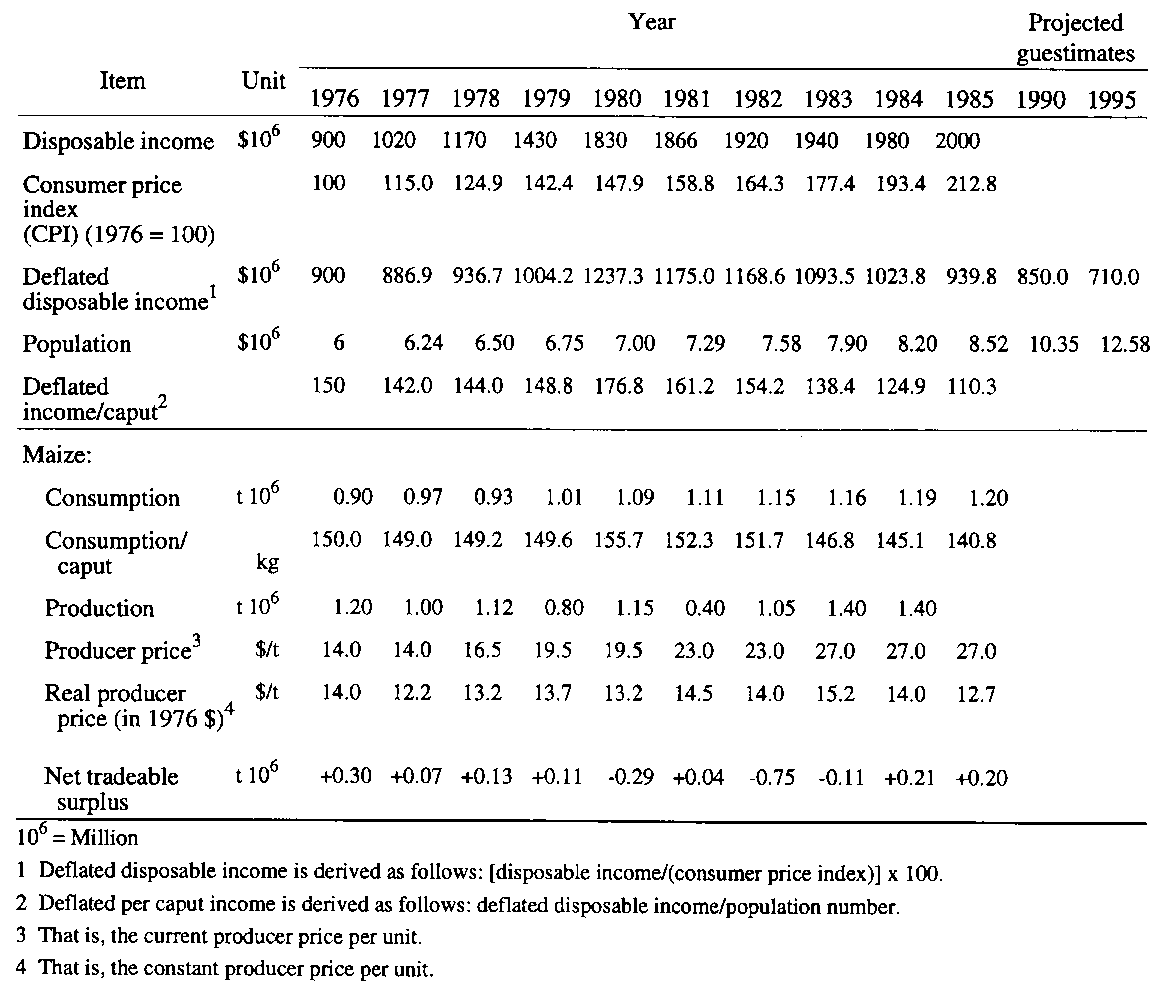 Table 3.10. Derivation of real producer prices and per caput consumption of maize, 1976-95.