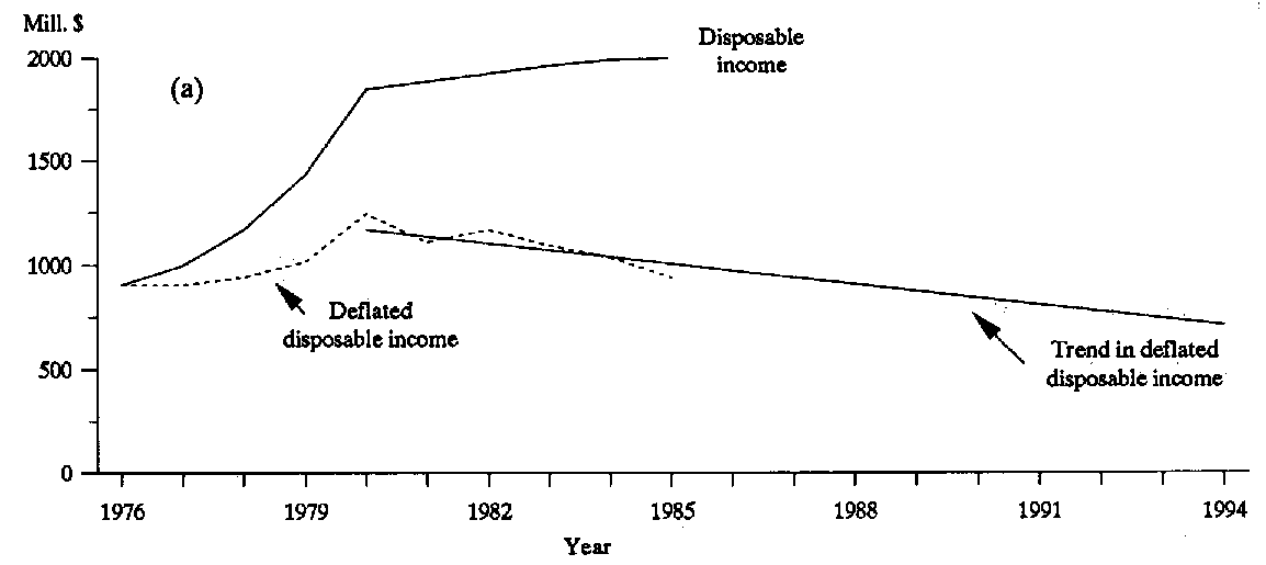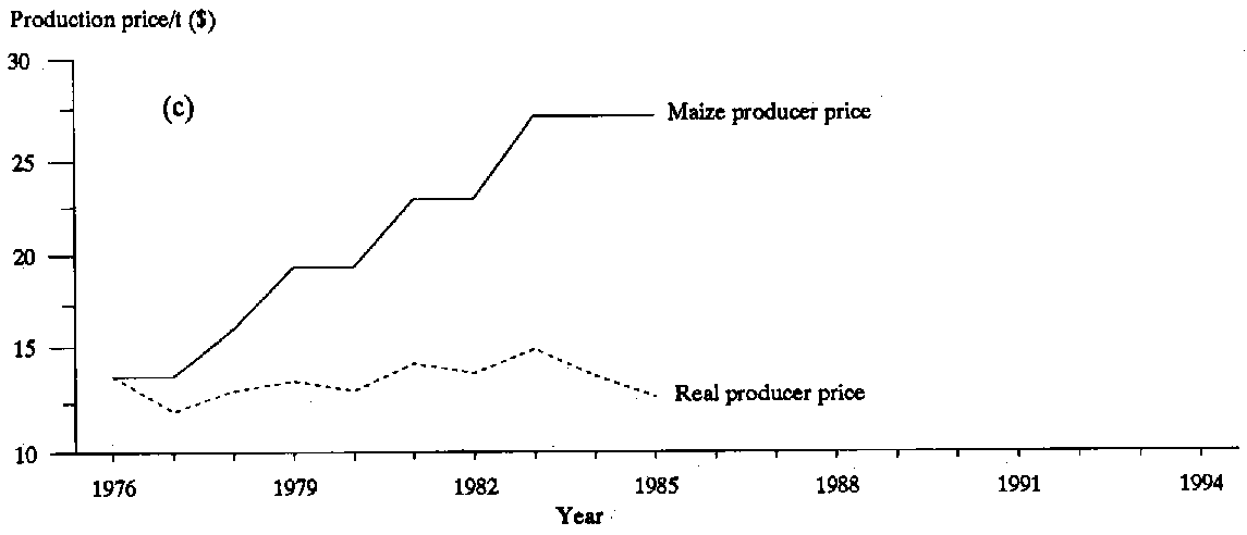 Example: Table 3.10 provides country statistics on disposable income, the consumer price index and population numbers for 1976-95. These are then related to consumption and production data for maize and to producer prices, in order to determine consumption per caput and real producer prices for each year of the period. Figure 3.10 presents the data from Table 3.10 in graphical form.