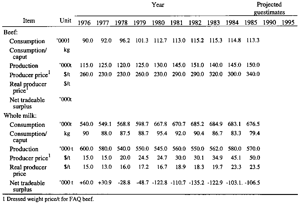 Table 3.11. Production. consumption and producer prices of beef and whole milk, 1976-95.