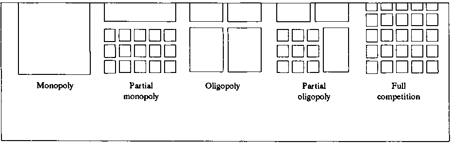 A system of perfect competition is often difficult to find. Many marketing systems are characterised by some degree of imperfect competition, where some agents have the ability to influence directly or indirectly, if not control, market prices. Imperfect competition occurs when one of the above requirements is not met and is usually seen in two general forms: monopoly and oligopoly. A monopoly exists when a single large supplier can dictate the market price because buyers have no alternative suppliers. (Monopsony is the case of a single buyer). An oligopoly occurs when there are only a few large actors in the market. This reduces competition and allows these actors (whether deliberately in concert or not), to influence market prices to their benefit. Both of these situations result in increased costs for other market actors and inefficient use of market resources as a whole. Inefficient resource use results when monopolists receive greater returns than they "deserve" (i.e. greater than "normal" profits). Those resources cannot then be used elsewhere. Figure 2 illustrates the concepts of complete and partial monopolies and oligopoly.