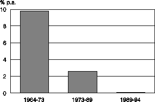 Sawnwood consumption grew strongly between 1964 (in fact from the early 1950s, but these data are not included in the data base) and 1973, but thereafter developments have been marked more by fluctuations in the business cycle than by sustained expansion. In only three years did consumption exceed that of 1973 (1979, 1980 and 1990), and there were periods of low consumption in the 1980s (1981-85) and the 1990s (1991-94). European production has consistently accounted for 85-95 per cent of consumption, and is supplemented by imports of coniferous sawnwood from Canada and Russia, and of non-coniferous sawnwood from south-east Asia and the USA. In 1994, however, imports of sawnwood from Canada and Russia fell, notably because of supply problems and the demand of the giant American market. At the same time, European exports by the Nordic countries and Austria to other regions grew. It remains to be seen whether this is a passing phase of the market or a genuine structural change.