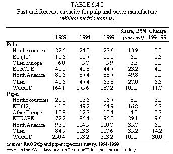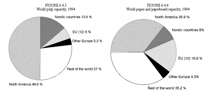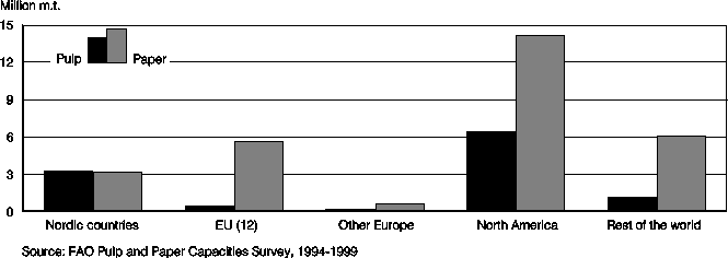 The largest units of all are in the pulp sector where economies of scale and international competition have pushed the size and cost of a "world class" Kraft pulp mill beyond half a million tons and half a billion dollars. Because of the economies of scale, pulp manufacturers need secure access to a very large, uniform source of competitively priced raw material. It is increasingly difficult to satisfy these conditions for new ("green field") plants in Europe outside the Nordic countries. Environmental limitations on emissions and effluent also restrict the choice of suitable sites for large pulp mills. Table 6.4.2 shows that nearly half the world's pulp capacity is in North America, and a third in Europe. There is about twice as much pulp capacity in the Nordic countries than in the EU. The forecasts collected by the FAO in its annual survey of the sector show that most of the expansion in pulp capacity over the next five years is expected in countries outside Europe and North America, principally in Asia.