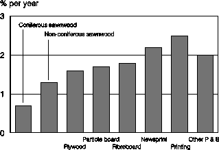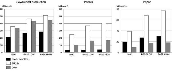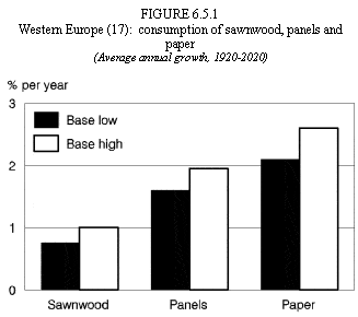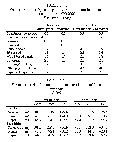 On the assumptions set out above, both consumption and production of forest products in western Europe (i.e. the 17 market economies for which econometric analysis was carried out) are projected to continue to grow over the long term, but at a modest rate. Consumption of paper and paperboard is expected to grow rather faster than that of panels, and that of sawnwood the slowest of all. For panels and paper, European production is expected to grow slower than consumption, causing net imports to rise, while the opposite is true for sawnwood. The fastest growth will be for printing and writing paper, which has seen very rapid expansion in recent years.