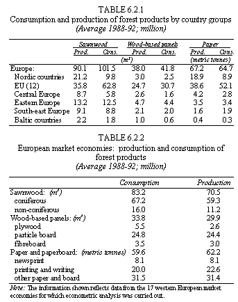 Econometric methods are only used to project production and consumption in the western market economies (the 17 countries listed in footnotes 8 and 11), which together account for about 80 per cent of consumption of sawnwood and panels and over 90 per cent of paper consumption. Nevertheless, to avoid duplication and simplify presentation, in most of this chapter, trends and projections are shown for Europe as a whole, including other countries for which different forecasting methods were used, notably the transition economies (discussed in chapter 10).
