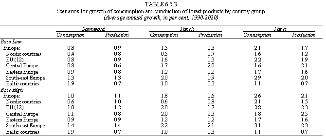 Although the annual growth rates appear relatively modest, over the projection period, for Europe as a whole (including the transition economies) they accumulate to quite large volume increases: 29-37 million m3 for sawnwood consumption, 24-30 million m3 for panels consumption and 57-77 million m.t. for paper consumption; increases over the thirty year period of respectively a third, a half, and around 100 per cent of the 1990 figure. The question of where the raw material can be found for this increase in consumption is discussed in chapter 11.
