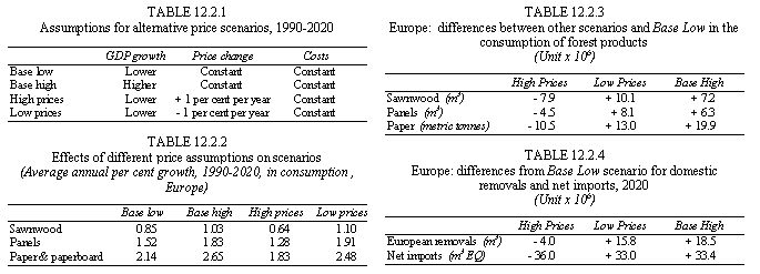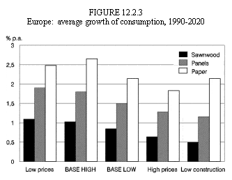 The econometric analysis presented in chapter 6 has shown that demand for forest products is indeed price elastic: thus higher prices cause lower levels of consumption and vice versa. The magnitude of the price elasticity naturally varies between countries and products. The effects on consumption growth of a change in prices is summarised in table 12.2.2, which shows the growth rate of European3 consumption under four different hypotheses, which are laid out in table 12.2.1.