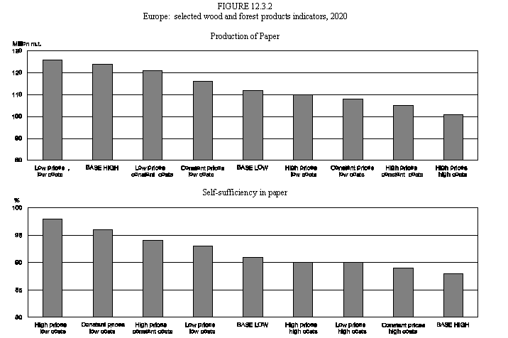 Table 12.3.3 confirms that there is a strong link between European raw material costs and the continent's self sufficiency in forest products. If wood and/or pulp costs in Europe were to rise by 1 per cent per year to 2020, with other parameters (including the total size of markets), unchanged, demand for European removals would be just under 20 million m3 (4 per cent) lower than in the Base Low scenario, and imports from other regions would be correspondingly higher. If, on the other hand, European wood costs fell by 1 per cent per year, demand for European roundwood would be 25 million m3 higher than in the Base Low scenario and net imports 29 million m3 lower. In fact, there would be a straight substitution between demand for domestic roundwood and net imports, mediated by changes in the price of European roundwood and residues.